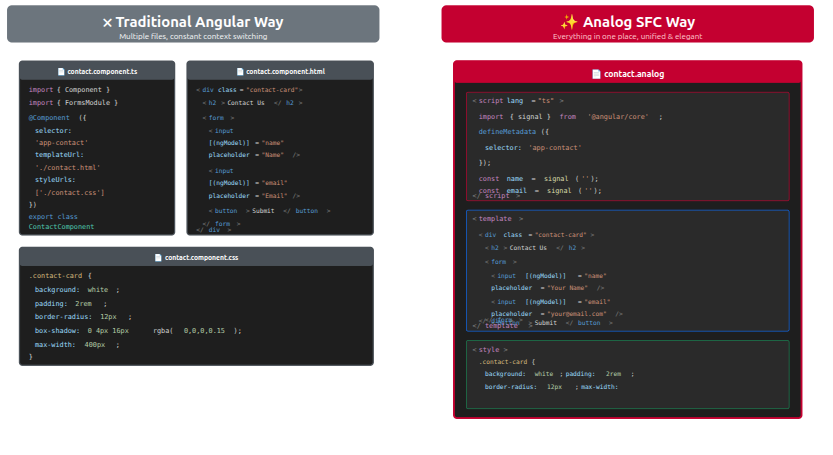 Analog SFCs bring a fresh approach to building components in Angular by combining the best of Angular's structure and Vue's elegance. Instead of managing separate files for templates, logic, and styles, you can keep everything in one cohesive .analog file.