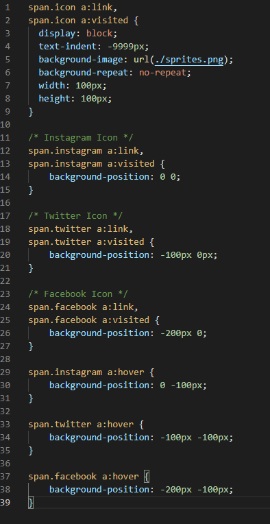 Image sprites are generally used for designing a graphic social media bar or a navigation bar to make it more attractive and efficient at the same time. It is just a method in HTML and CSS to implement a more efficient way of putting images and designing web pages. Additionally, the image size itself is smaller, resulting in less bandwidth usage by the site.