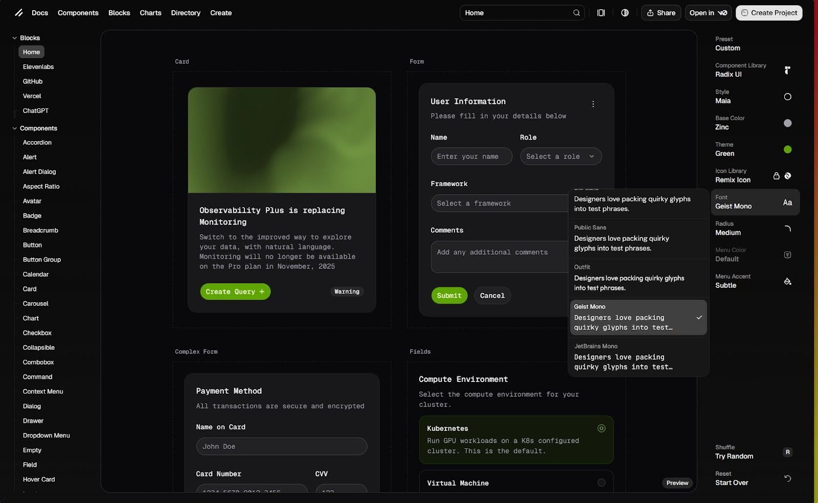 shadcn/ui has a very useful tool that will let you customize and see how your UI library will look even before you start. You can pick your base component library, theme colours, choose from a variety of icons, pick the font, and more (image 1). It’s kind of like the character creation screen in video games.