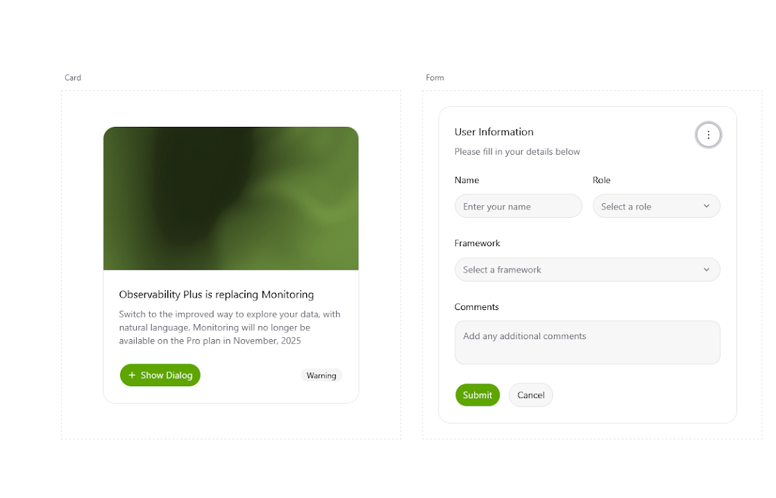 After you’re done customizing your UI, you can pick your preferred framework and you will get a command that you can paste into your terminal and create your project (image 2). Your changes will be preserved in the URL, so you can share your custom UI with colleagues (or bookmark it for later use). This is what we’re working with today.