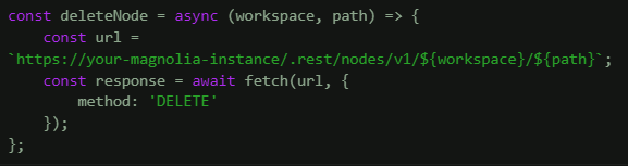 To delete a node, use the DELETE method and make sure to include the workspace and the node's path as path parameters in the URL.