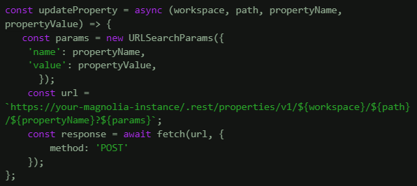To update a property, send a POST request with the workspace and the node's path as path parameters, and include the property's name in the path.