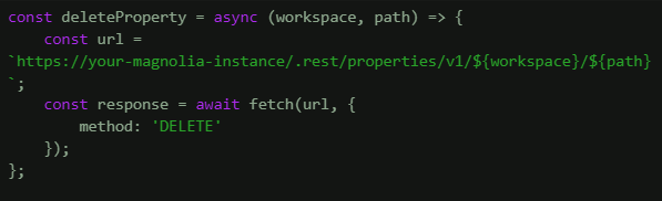 To delete a property, use the DELETE method and include the workspace and the property's path as path parameters.
