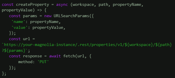 To create a new property, send a PUT request with the workspace and the node's path as path parameters.
