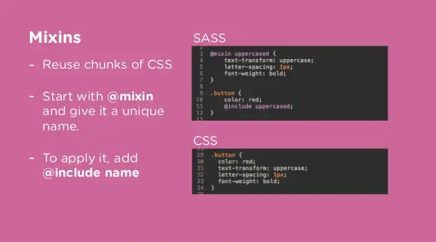 A mixin lets you group multiple code lines together that can be reused throughout your site. They can also be configured with variables, thus making them more flexible!